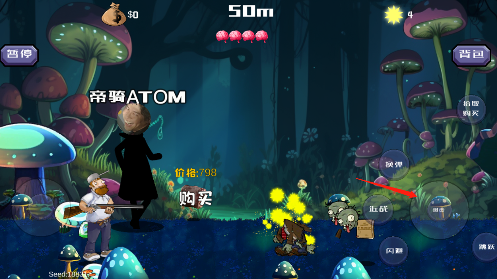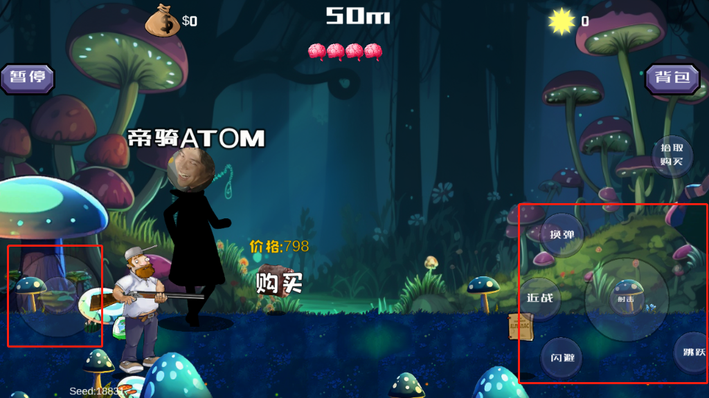 2、左侧虚拟摇杆控制角色位移方向,右侧区域为交互操作区;屏幕顶部中央的脑形图标代表生命值,一旦被僵尸完全侵蚀即判定失败;