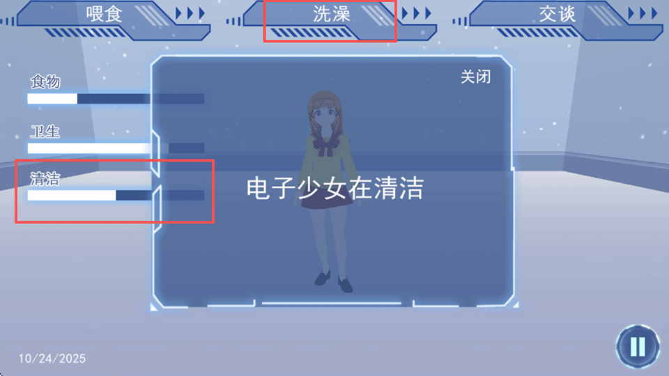 4、如果卫生值下降,则需要及时安排她洗澡或进行清洁,让角色保持良好的状态与心情。