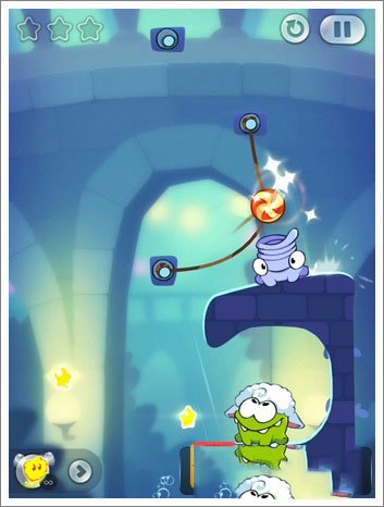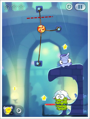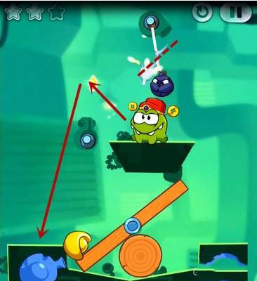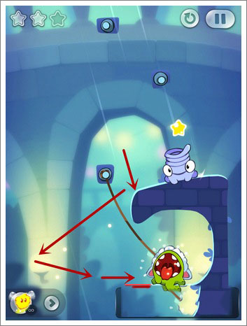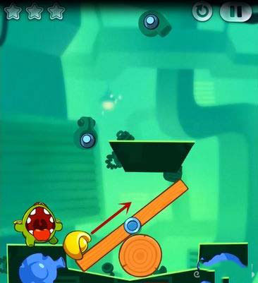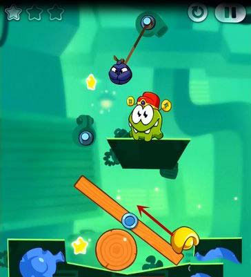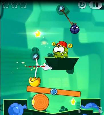 1、优先剪断Om Nom嘴上方绳索,让糖果自然下坠,精准掠过第一颗星(规避Toss抓取)。