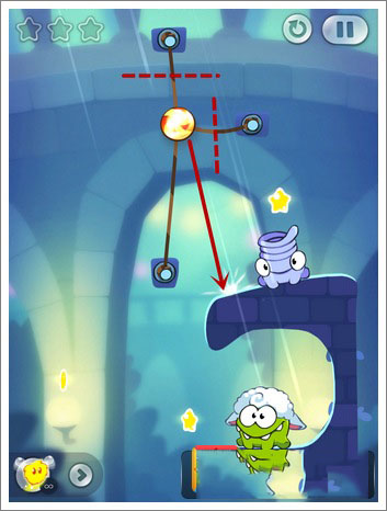 2、待星星收集完毕,再剪断糖果正上方绳索,使其垂直落入Toss头顶,为后续弹射蓄势。