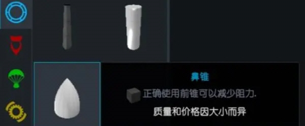 主要放置于火箭前端,减少火箭前进阻力,可修改形状有限,只有下面一个零件接口,个人认为用处不大,因为火箭前端完全可以用燃料罐捏出想要的任何形状。