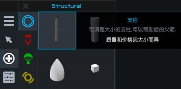 简单火箭2中的支柱可修改其形状、颜色,主要用于装饰火箭,以及补充其它零件所不具备的功能,其中,最特殊的就是支柱不受零件接口的影响,支柱可以安装到其他零件的任何地方,方便零件之间的安装。