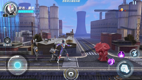虚拟摇杆控制移动,短按攻击键触发连段,长按释放蓄力重击,技能键释放奥特曼专属光线技,跳跃键实现位移与闪避双重功能。