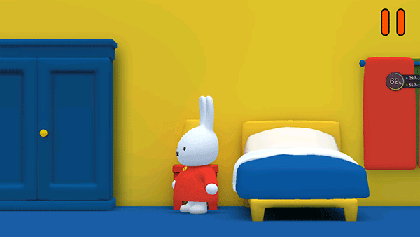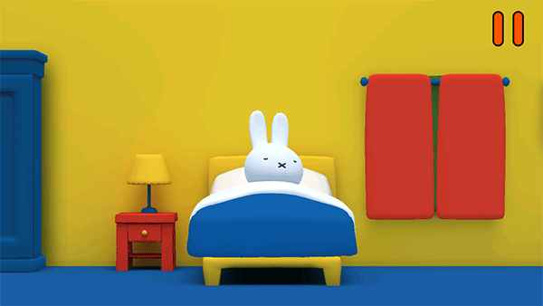 2、轻触米菲,她会眨眨眼、伸懒腰,随后可拖拽她走向不同区域:厨房、花园、浴室或客厅,每一次移动都会触发对应情境动画;