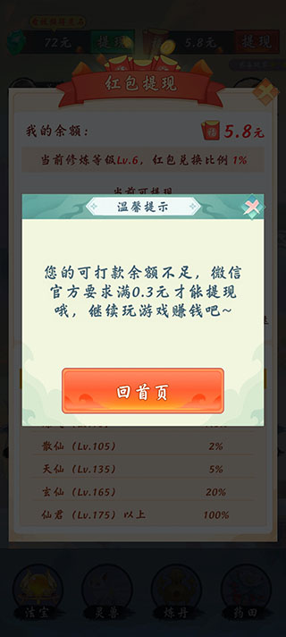 1. 修仙成长:玩家可以通过不断升级法宝、灵宠等方式来提升自己的修为等级,同时也可以领取红包奖励。