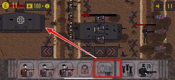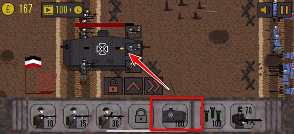 4、战斗中点击地面空白处可呼出兵种菜单,数字代表当前金币消耗值;随等级提升,将陆续开放装甲列车、毒气炮、侦察气球等特色单位;