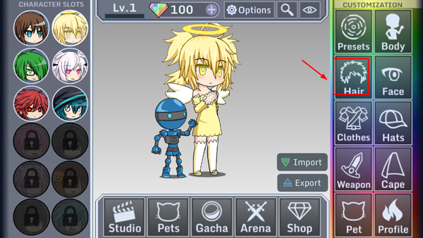 1、进入游戏主界面后,点击右侧面板中的Hair图标,即刻激活角色造型编辑入口;