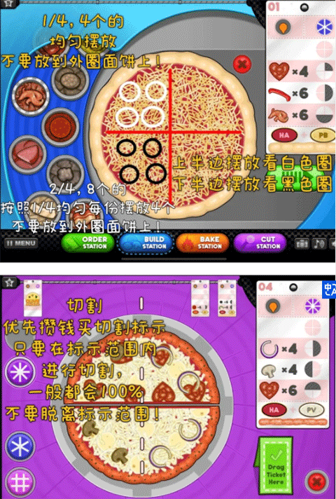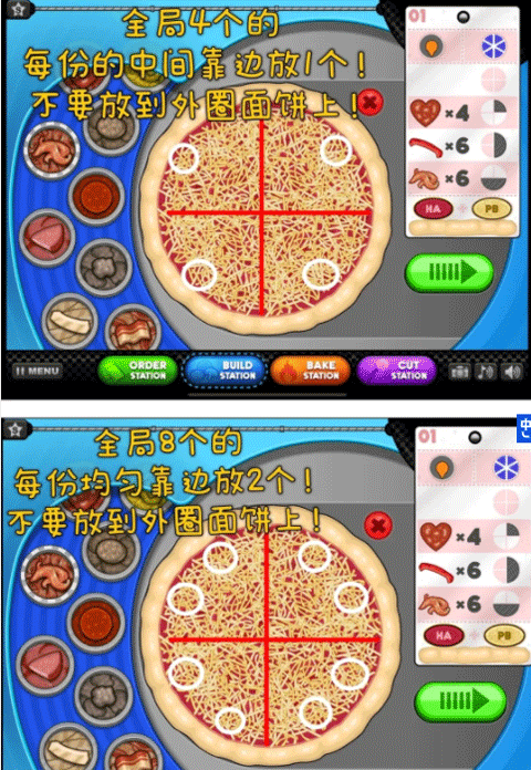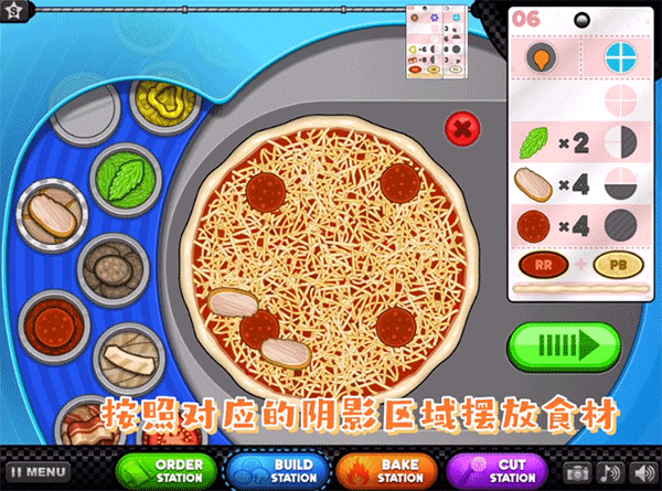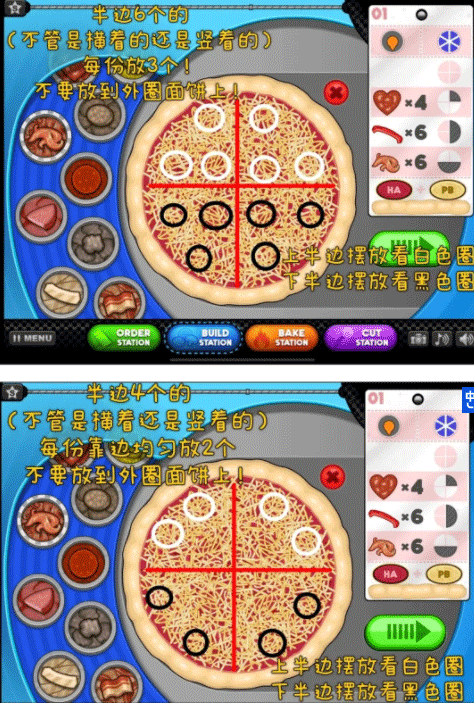 3、食材摆放须严格参照右侧图示阴影区域分布,坚持“分区均布”原则——将整张饼虚拟划分为四个象限,按指令数量平均分配至各象限中心偏内侧位置。