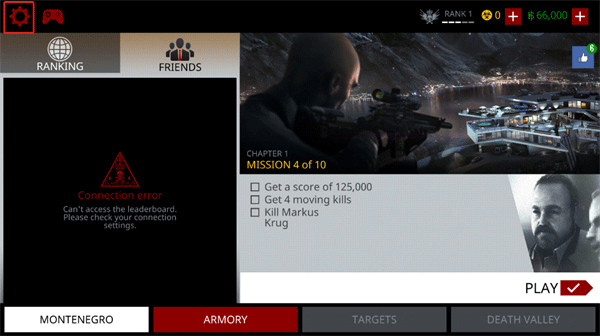 1、启动杀手47手游中文版,点击界面左上角齿轮图标进入系统设置;