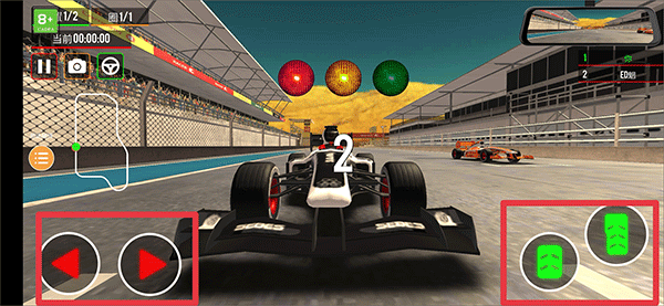 4、游戏开始后左下角红色按钮控制赛车的方向,右边绿色按钮控制赛车的后退和前进