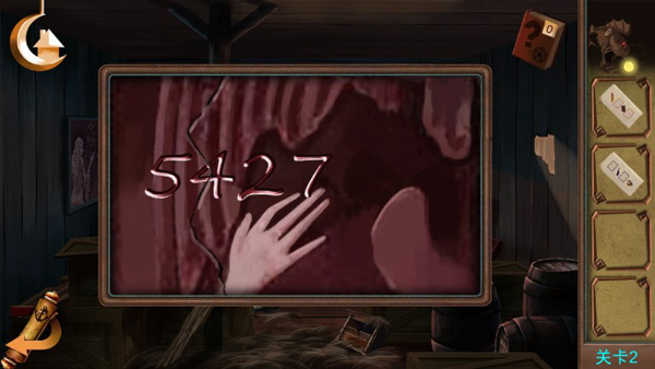 将残卷放回墙上,得到开锁密码,输入密码5427,打开得到钥匙,开门逃脱。