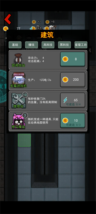 1、在“建筑”菜单的“基础”栏中,仅需8金币即可部署笤帚炮台——前期性价比极高的入门级输出单位。