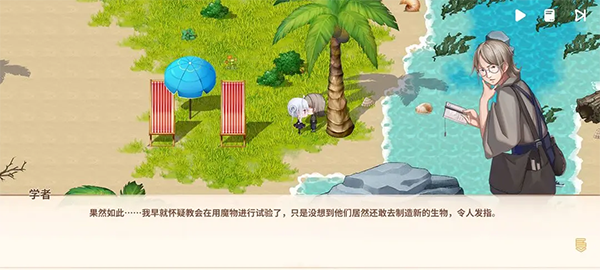五、沙滩地图——本章以轻快解谜与角色互动为主轴,核心挑战在于暴打两名自诩“深海霸主”的滑稽魔物。唯一高价值成就“隐秘之瞳”,需协助左侧学者完成文献复原:收集散落的古籍残页、星图碎片与潮汐罗盘。主线结束后再次对话,学者将提出哲学诘问——选择“被何种力量所塑造”;据此答案导向不同跑图路径与隐藏文本,最终解锁成就并收束本章叙事。
