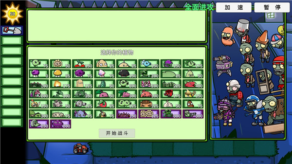 2、战前布阵阶段可自由选择出战植物,右侧实时预览当前关卡将出现的僵尸类型,便于针对性部署。