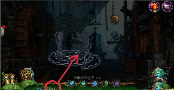 11、出来,用【带镣铐的链子】放在左边矮人上;再去点击左边的【矮人】,拉开右边机关的石板。