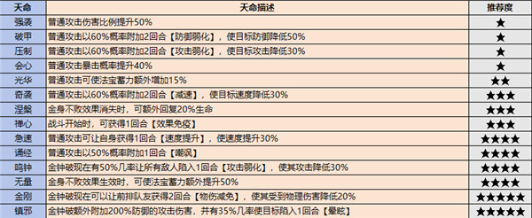 只有绝伦以上的高品质弟子才会自带天命,天命技能也有优劣之分,这里整理了一下各职业的天命排行,大家可以参考一下。值得注意的是,紫色弟子也可以通过服用九转金丹获得天命效果。