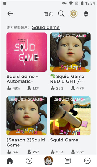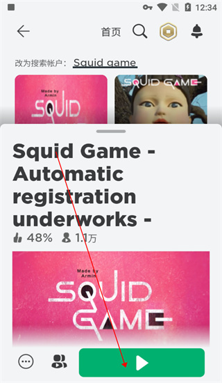 Squid game进入指引:同样于搜索栏输入"Squid game",筛选点赞率近48%、实时人数约1.1万的热门房间,确认后点击进入。