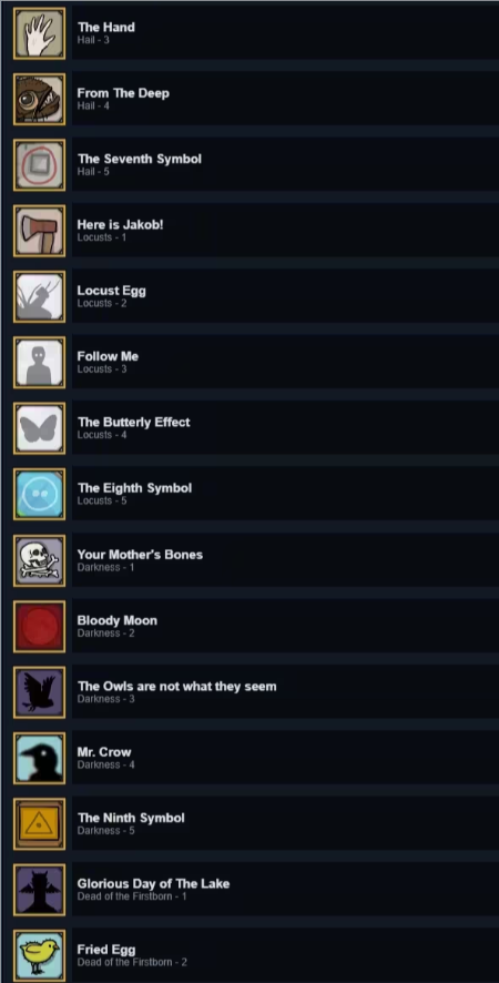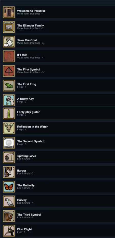 这次天堂岛游戏一共51个成就,其中50个在游戏中,游戏中一共分为十小关,每关五个小成就,一个隐藏符号成就四个如下图