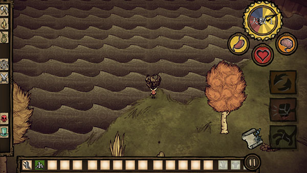 5、角色苏醒后,左侧虚拟摇杆控制移动,右侧交互键执行采集/建造/攻击,优先搜寻浆果丛、草堆与树枝以建立初始物资链。
