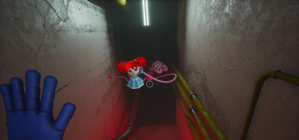 坠入洞穴后,左侧谜题实为声波谐振装置:需敲击不同锈蚀管道,使回声频率匹配墙上蚀刻的波形图。成功后,红手解锁的门内侧竟印着与Poppy腕部疤痕相同的纹路。