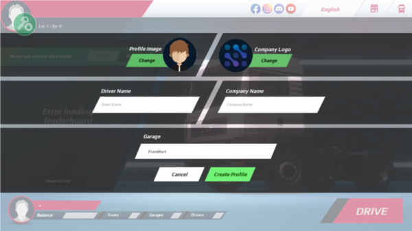 1、进入游戏后点击右下角的【DRIVE】开始游戏,然后输入姓名,游戏公司名称后,点击【Create Profile】即可创建。
