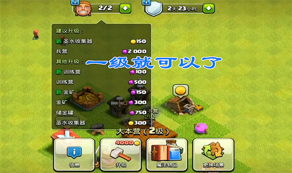 玩家一开始会获得一座“建筑工人小屋”及各一座等级1的“大本营”、“金矿”、“兵营”以及各750点的“圣水”和“黄金”,第一次进入游戏会进入引导模式让玩家了解此游戏的建造、升级、提速及解锁的方式。