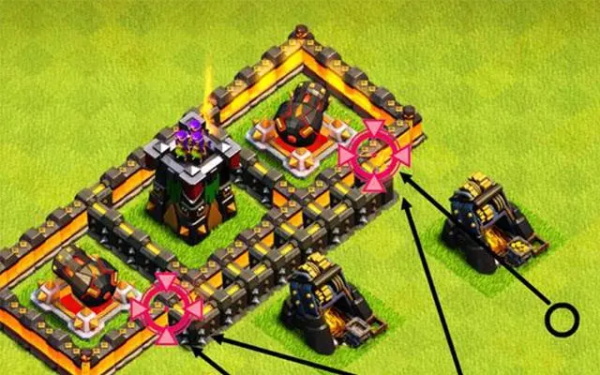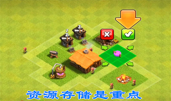 玩家建筑自己的部落时,需要考虑排兵布阵,将城墙、炮塔等组织好,用以防御来敌。而进攻时,是将自己训练的士兵投放到对方的地图,此时,需要灵活的根据自己训练的兵种选择投放地点,依靠阵型来打击对方城防的弱点。