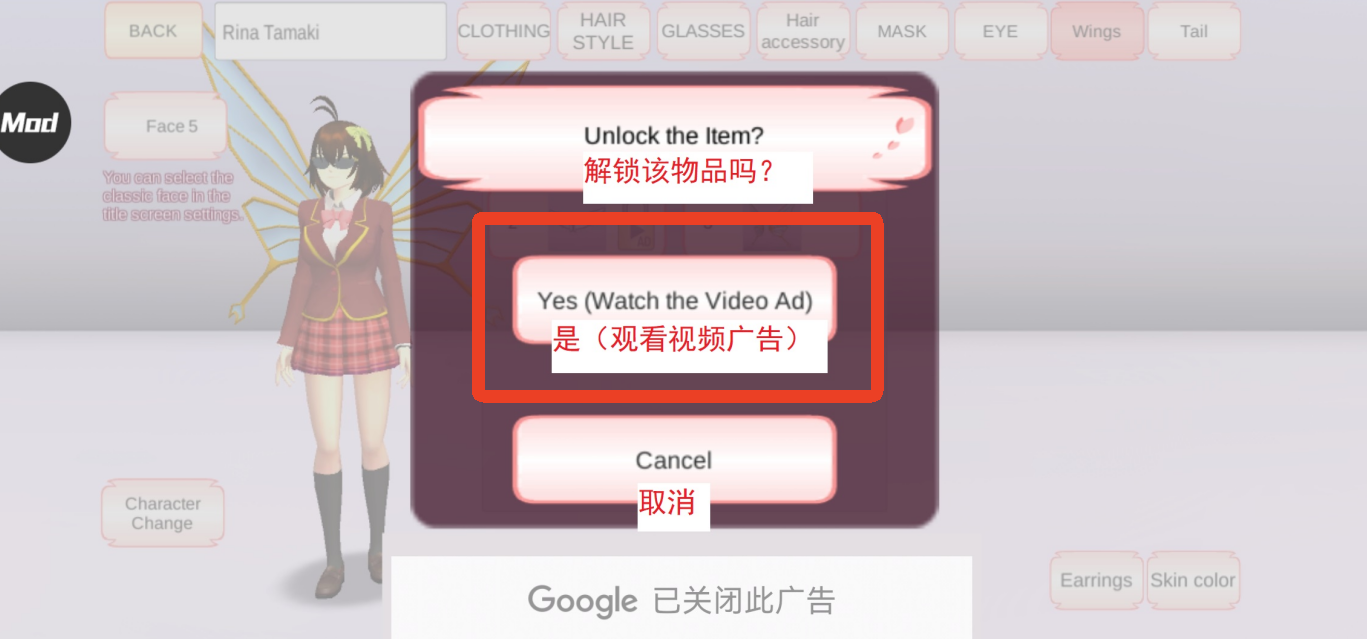 5、不用担心,我们已经开启了MOD,点击上锁的翅膀之后再点击【Yes(Watch the Ad)】,就能成功解锁了。