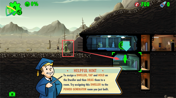 房间建成后,你需要分配居民来操作。此时,居民会陆续进入避难所并待在门口。将他们拖动到发电厂,他们就会开始工作,房间会开始生成资源。