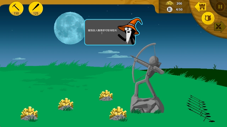然后等敌人来了后控制矛兵,然后让矿工撤退,让城堡弓兵射,你就顶个盾吸引伤害不让敌人打雕像就行了