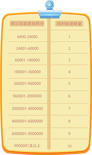 师父所能同时指导的徒弟数量,与其游戏积分呈正相关,积分越高,承载力越强——具体对应关系如下: