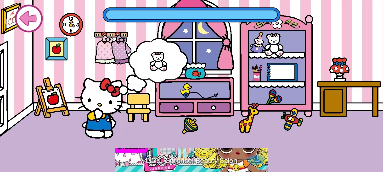 4、进入互动场景后,留意凯蒂猫头顶浮现的愿望气泡——点击她想喝的温牛奶、想听的故事书或想抱的小熊玩偶;