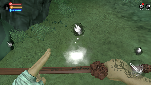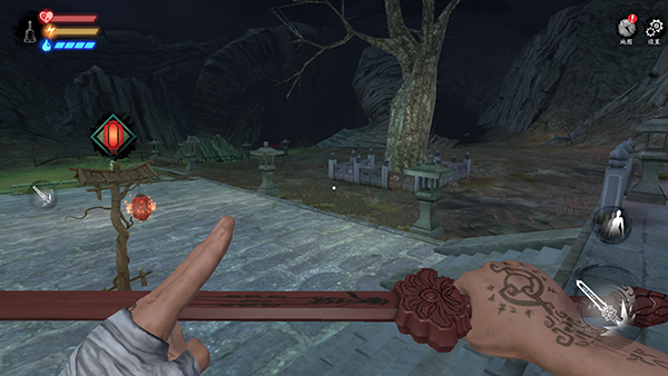 这里有三个小怪比较好打,小怪在发现自己时会有一段空闲时间,在这段时间内使用桃木剑进行攻击,如果没打死 边打边退,看到小怪抬手攻击时闪避即可