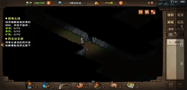 3、进入溶洞后点燃火折子照明,前往(25,13)区域探查石壁机关,启动后传送至(10,8)附近,仔细搜索即可发现封存已久的《文皇经·残篇一》。