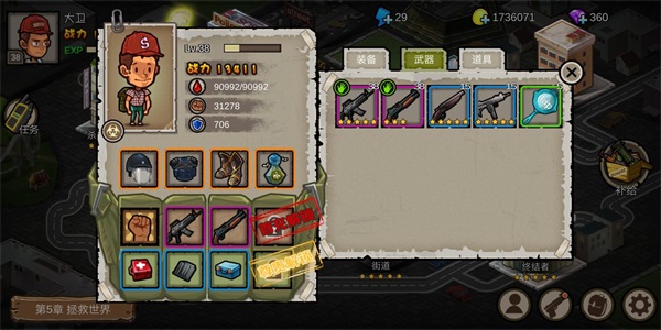 6、第五章第10关扫荡刷橙色装备碎片(终结者):5-10这一关(2.06版本剧情模式最终关卡)需要玩家学会利用距离吸引僵尸,必须分批次把僵尸慢慢引过来杀,不能一口气引几十个,那样很容易被秒,5-10这一关只要BOSS在玩家屏幕外,基本上就不追玩家了,好好利用这一点才能过关。