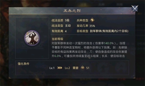 50%概率为单目标附加增益,受限于战法射程(仅4格),必须部署于中军方可生效。虽有彤素等优质弓系宝物加持,但站位刚性较强,需结合剧本特性谨慎选择。