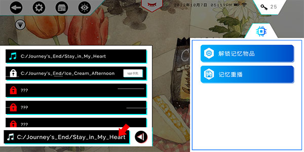 3、主界面中央为「记忆核心」选择区,点击任一发光节点即可进入对应章节;右下角芯片图标为记忆中枢,长按可浏览已解锁的记忆图鉴或循环播放关键片段