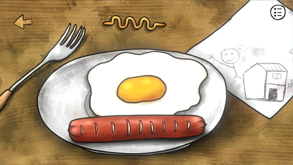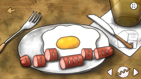 二次点击餐桌,露出被香肠遮盖的锯齿小刀;香肠切面六道刮痕对应数字111312(每道痕深浅暗示数值权重)