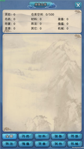 点击仓库,你可以查看家族的武器、装备等资源。