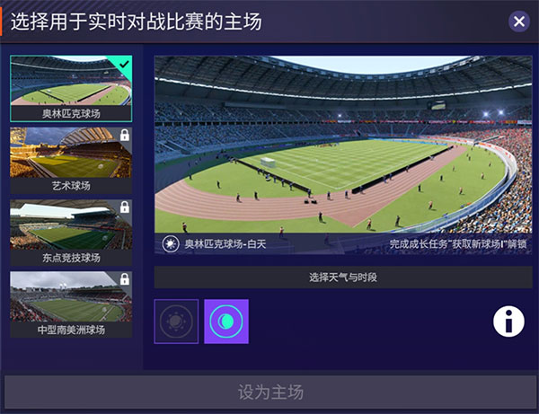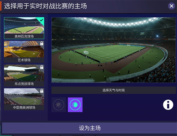支持12种天气×8个时段的自由组合,雨夜伯纳乌的积水反射、晴空诺坎普的草皮光泽、黄昏安联的光影渐变皆可实时预览。选定主场后,系统自动匹配对应音效包,让每一次哨响都浸透真实足球氛围。
