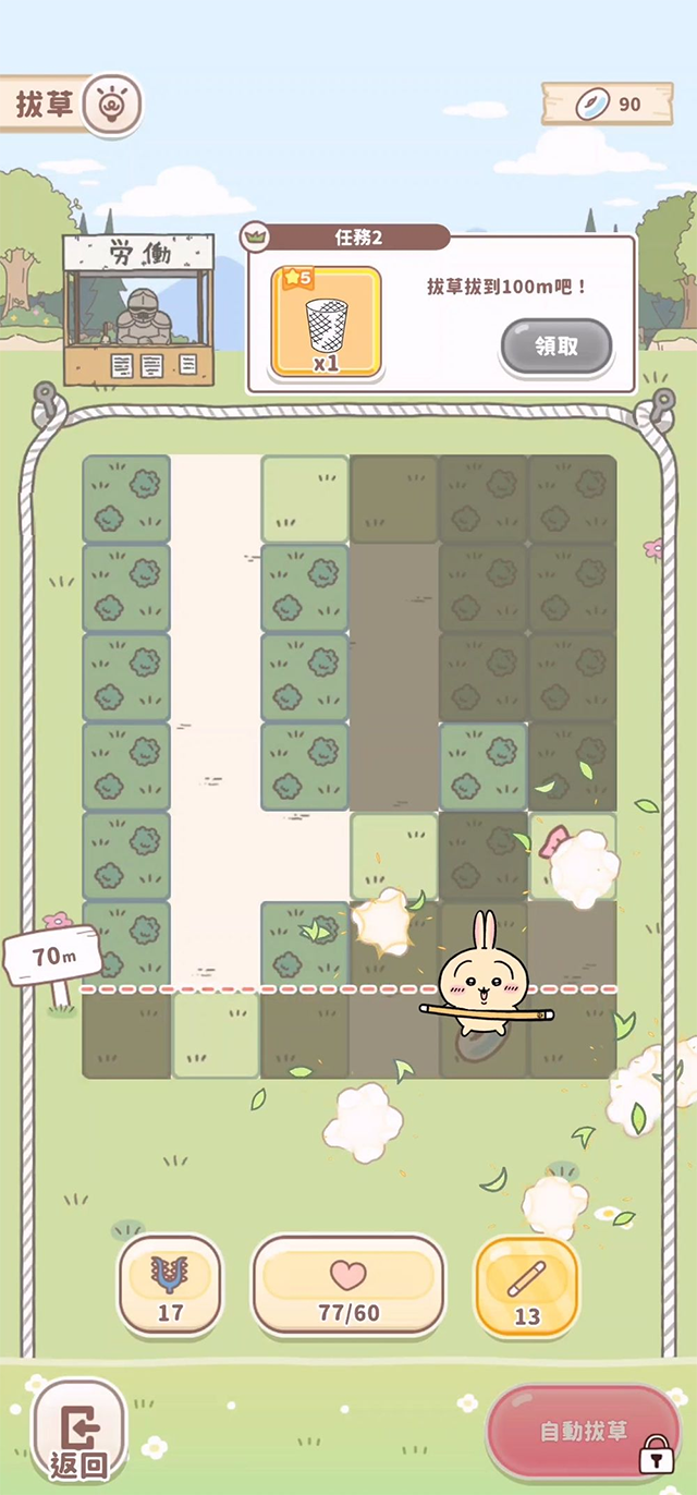「拔草」不只是资源收集,更是一场静谧的指尖冥想:亮起的方格如微光召唤,点击即见泥土松动、杂草飞散,偶有金币跃出、宝石闪烁,或是那颗标志性的口哨糖静静躺在叶脉间。消耗的“元气”会随真实时间缓缓回满,提醒你——生活不必赶路,休息本身就有意义。