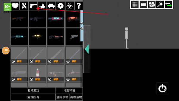 1、进入游戏后,点开状态栏,然后创建一个假人,然后选择你的武器;