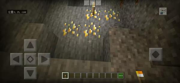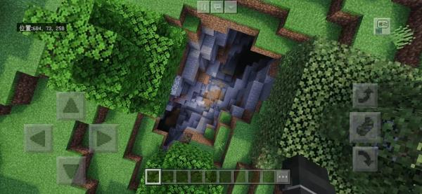 出生点正下方即为巨型竖井矿洞,多层岔道纵横交错,天然形成高效采矿动线。建议携带火把与指南针,沿主通道向下探索,可快速获取大量煤炭、铁矿及少量红石——是生存初期快速积累资源的理想据点。(图中左上角已标注坐标参考)