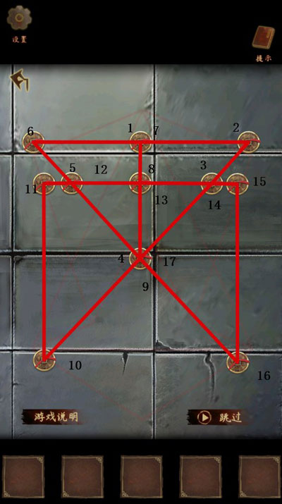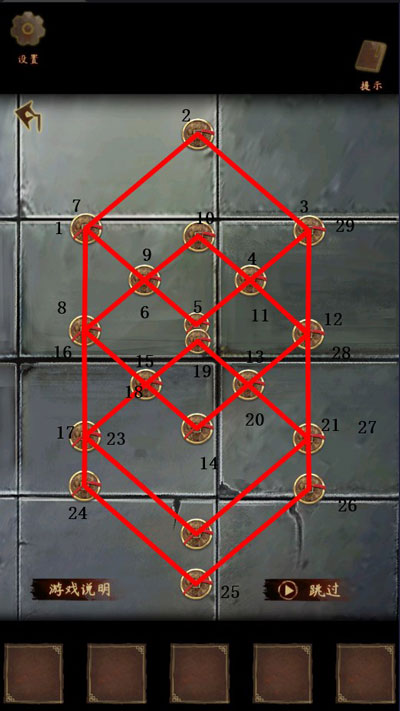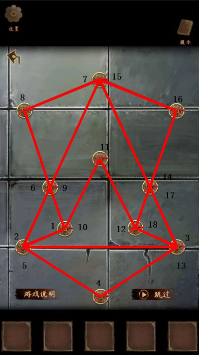 12、启动“破阵连线”机制:需以一笔连通全部卦点,且起止皆为阳爻位(即奇数编号点)。三组阵图依次激活,每完成一组,地面纹路便亮起一道金光