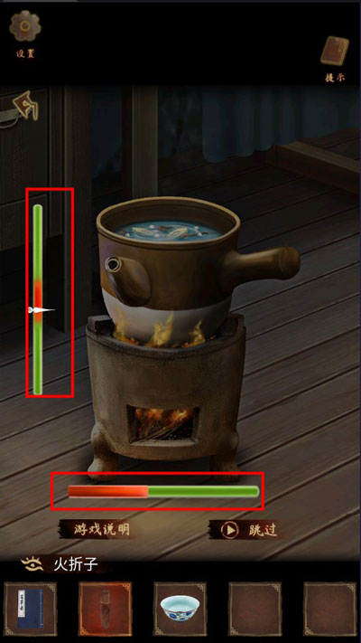 6、将药材投入陶制药罐,以【火折子】引燃罐下松枝。待水沸三息,点击罐身触发“控火”小游戏:依提示节奏点击,维持火势稳定(过旺则焦,过弱则不透)