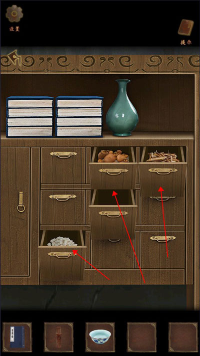 4、药柜共五格,逐层拉开——左二格空置,右三格藏有干枯艾草,唯正中一格暗扣微陷,按压弹开,取出【火折子】与素瓷【空碗】