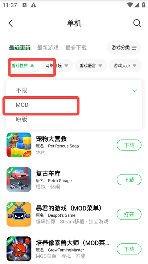 2、在游戏性质处选择为【MOD】。