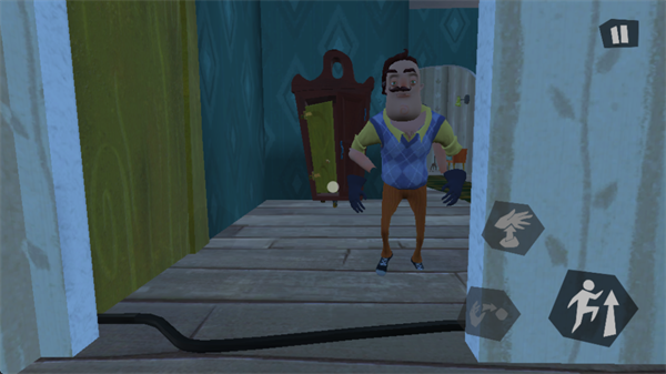 游戏采用第一人称视角,增加了玩家的沉浸感,刚开始时,邻居会突然出现并发现你,主人公会慌张地挥舞双手,而邻居则会直直冲向你,随着画面变黑,邻居的大脸越来越近,直到消失,随着游戏进程的推进,你会学会如何与邻居对抗,甚至逃脱他的追捕。