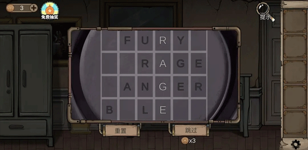 透过猫眼观察到四组情绪词汇:FURY/RAGE/ANGER/BILE,依序输入旋转密码盘