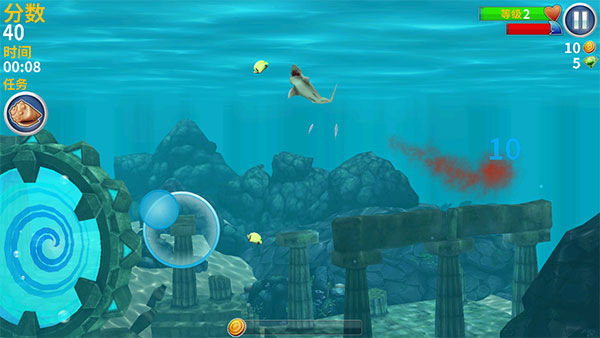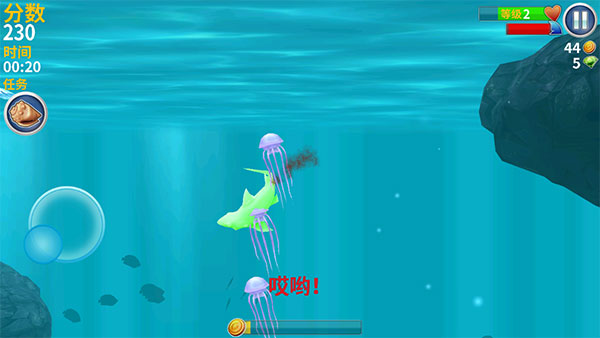 3、极简操控逻辑——单指按住屏幕任意位置即可驱动鲨鱼匀速前行,上手零门槛;